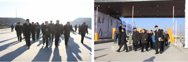 在保税物流中心卡口上方"青海曹家堡保税物流中心"以中英文两种字体呈现,海关标识赫然醒目。王黎明副省长一行在实地查看了1#、2#保税仓库、卡口、查验库、办事大厅等设施,并边走边听取物产集团总经理王玉辉关于工程施工进展情况的汇报。