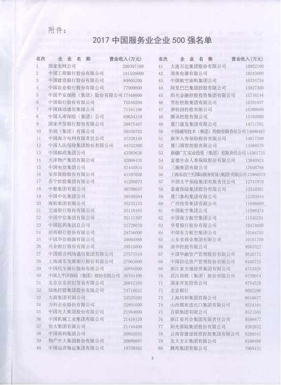 2017年,青海物产在省委、省政府、省国资委的坚强领导和亲切关怀下,在省属相关委厅局的热情帮助和大力支持下,牢牢把握"稳中求进、改革创新、又好又快"的原则,抢抓机遇,攻坚克难,扎实工作,保持了营收稳步增长的良好态势,集团再次入围"2017中国服务业企业500强",排名第397位。