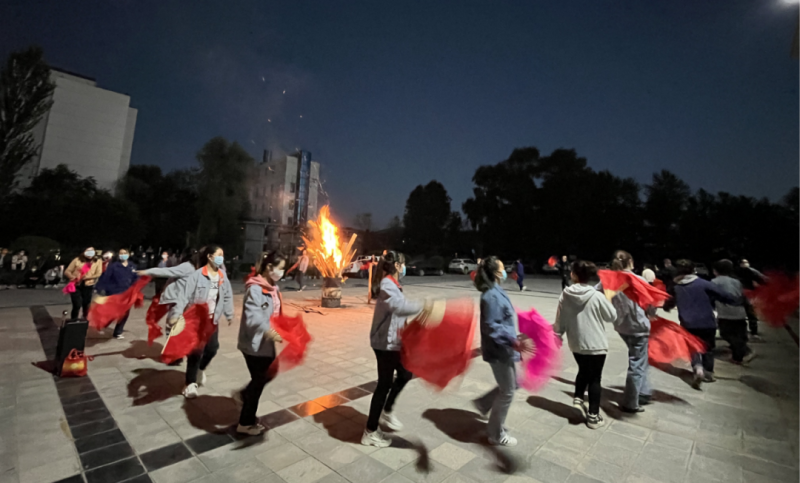 伴随着欢快的花儿小调,干部职工在月夜里围绕篝火载歌载舞、欢聚一堂,他们欢乐幸福的表情感染着驻足观看的每一位工友们。