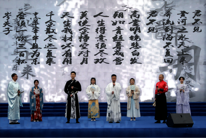青物书院为搞好此次活动,确保节目精益求精,组织集团系统职工高凯、郭宇、阿柏林、任蕊、王思涵等8名员工排练了富有特色的诗乐鸣响《将进酒》。在演出现场,悠扬婉转的古筝配上铿锵有力的诵读,将诗仙李白的传统经典赋予了新的形式,焕发出新的光彩,将活动现场推向了高潮,现场掌声雷动,展现出了青海物产集团职工奋发向上的精神风貌,塑造了青海物产书香企业的良好形象。